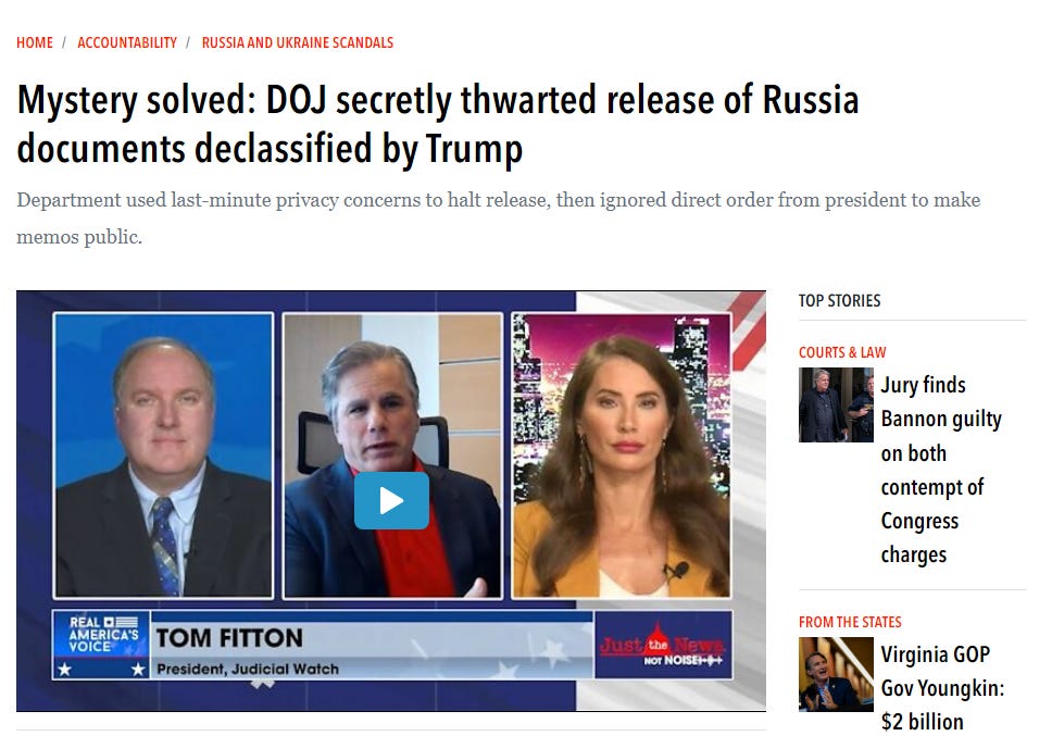 Now, at this late date, somebody from Just The News just happens to stumble over the Meadows memo at the National Archives showing the Department of Justice defied a direct Presidential order to publicly release these newly declassified RussiaGate documents to the US Congress, the news media, and by extension, the American public.