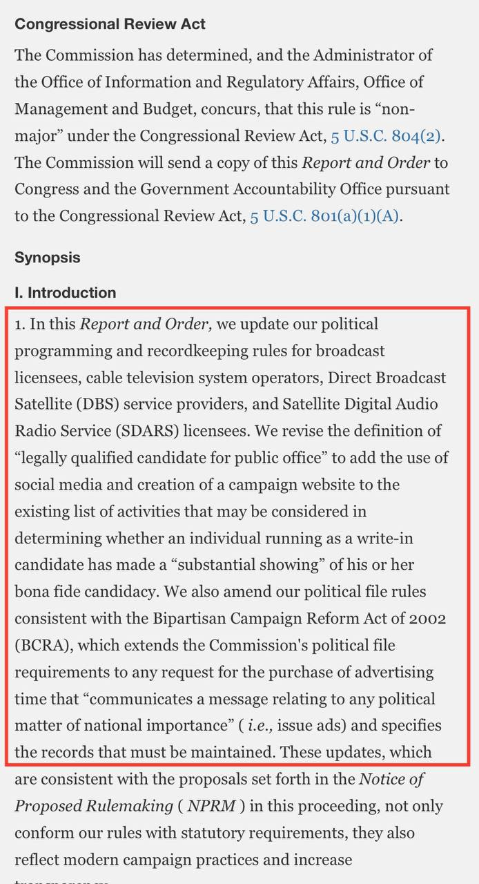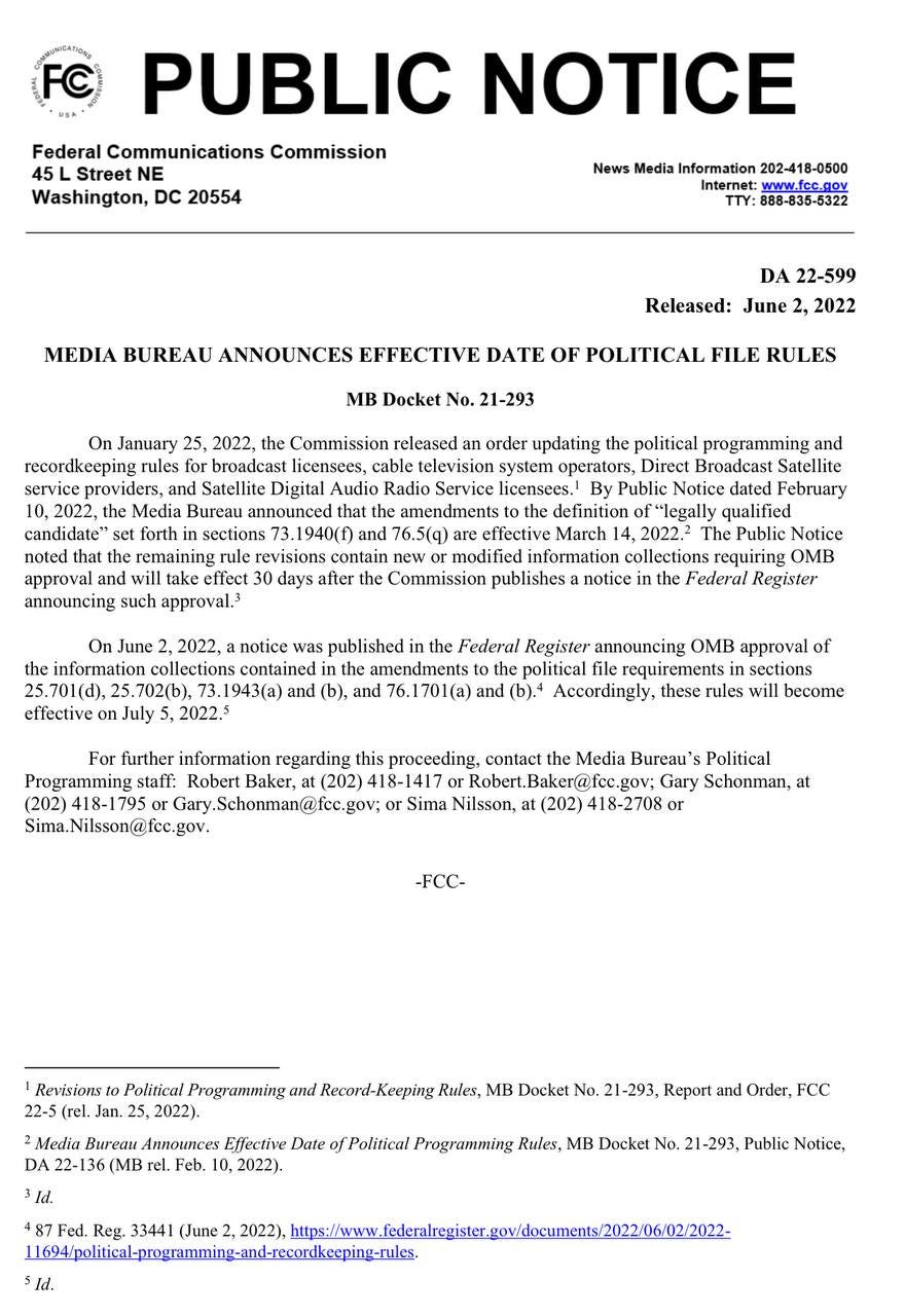In fact, a slew of new FCC revisions on political programming took effect on March 14th of this year. These new revisions were first announced the previous month, on February 10.
