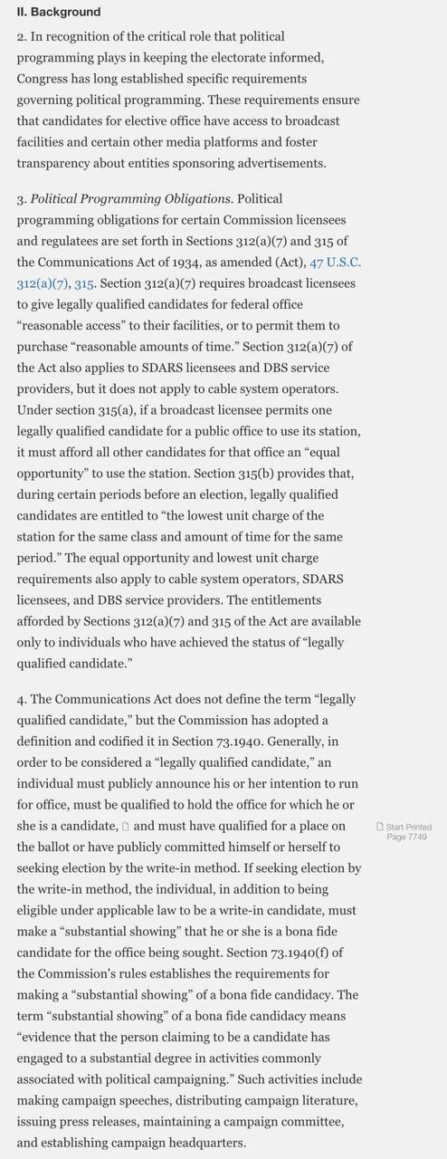Let me spell that out for you what this means: under these new revised FCC rules that took effect in March, the fact that Donald Trump has been **acting** like he’s campaigning for a political office means he’s now **covered by these revised regulations**.