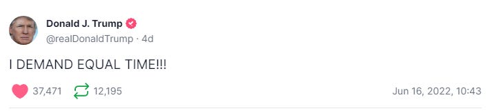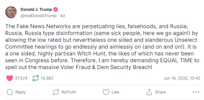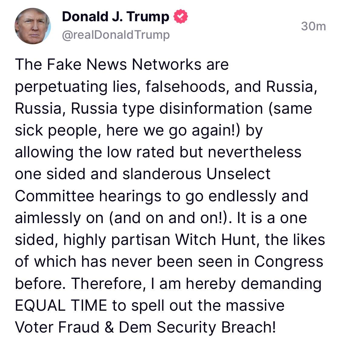 After writing his stupendous 12 page letter to the nation in which he laid out the case he wants to make, Donald Trump has now very loudly and very publicly begun to demand equal time via the very same Fake News Media outlets that have been devoting countless hours to the J6 Committee’s hearings.