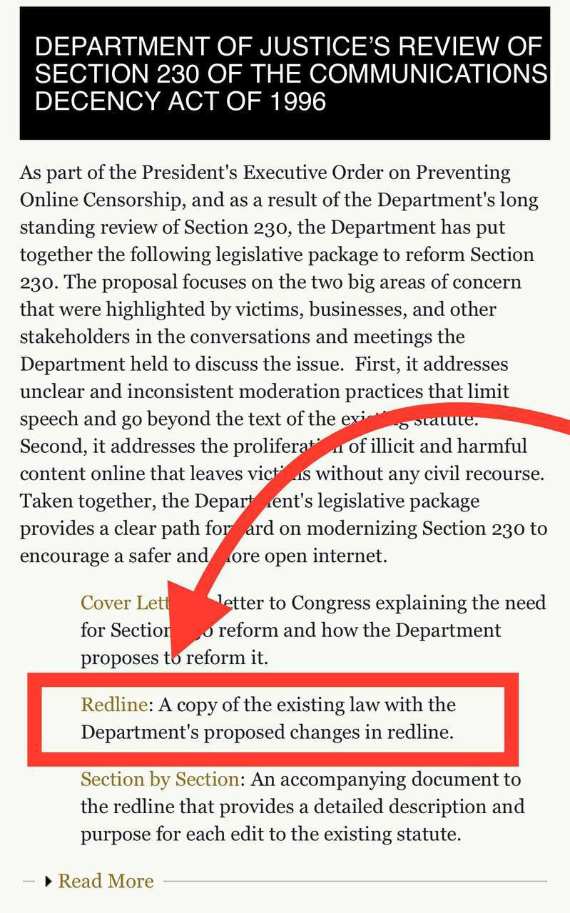 UPDATE: Joe Biden rescinded Trump’s EO on May 14,2021, according to Wikipedia. But did rescinding the EO presto change cause all the 230 reforms Barr redlined to be instantly removed and changed back? This is assuming Barr’s proposed changes ever took effect, something I am attempting to verify.