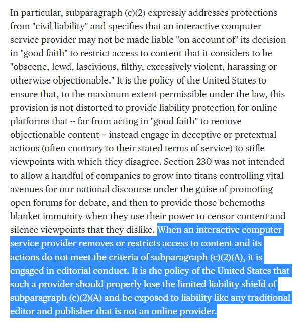 Let me translate for you: it means when it’s proven that TV networks and online news services defamed Trump and others by selectively editing or removing or restricting access to content, they are directly engaging in editorial conduct. It’s acting as a biased gatekeeper. Legally, that media entity loses it’s limited liability shield under the law and is then open to being **civilly sued for damages and/or equal time**.