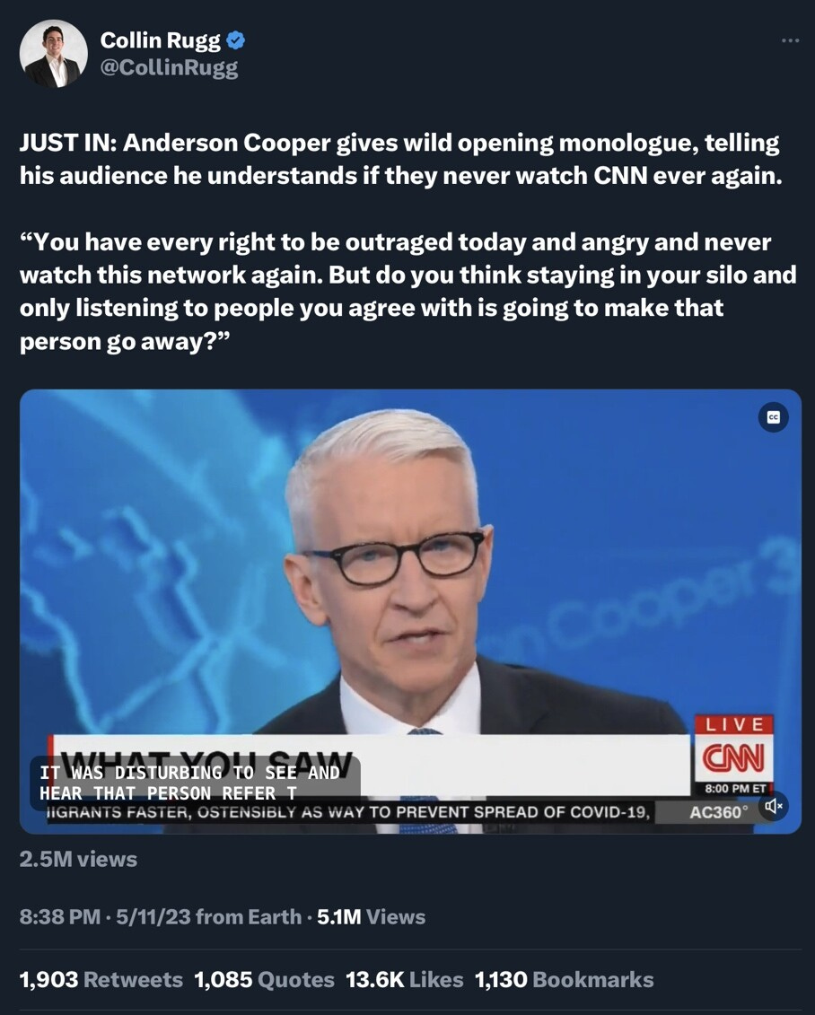 Twitter commentator Collin Rugg posted a Tweet about a bizarre rambling monologue that CNN host Anderson Cooper did at the beginning of his show the next night, as CNN tried to stop the bleeding.