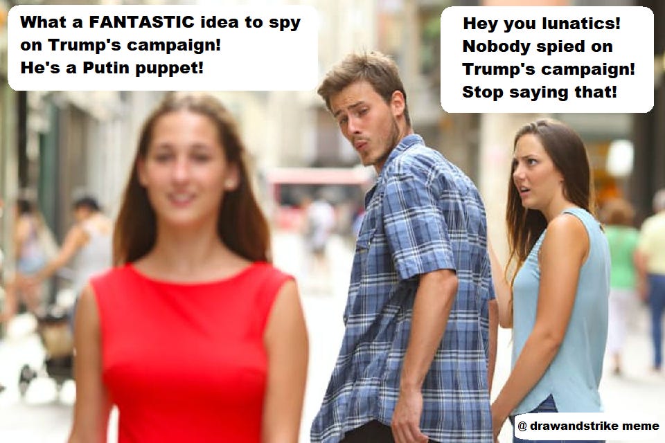 I even made a meme of it at the time, mocking the way the media instantly spun on a dime from a “Nobody spied on Trump and his campaign!” to a “Great idea to spy on Trump and his campaign!” narrative.