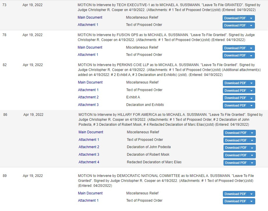 Screaming like outraged banshees at this development, you had Hillary For America, the DNC, Perkins Coie, Fusion GPS and Joffe/GT and all their lawyers streaming into court over the remainder of the day on the 19th, frantically filing motions in an attempt to stop the inevitable.