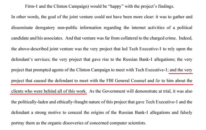 First, he got them all to admit they are trying to hide documents from his grand jury by claiming attorney client privilege - even when no lawyer was involved - and then he reminded them Sussmann **insisted in writing** he made his approach to the FBI all by himself and not for any client. Then he demonstrated to the court that all these parties are lying to it about Fusion having been hired solely for ‘legal advice’ and most certainly not for opposition research or to construct Trump/Russia hoaxes or anything like that.
