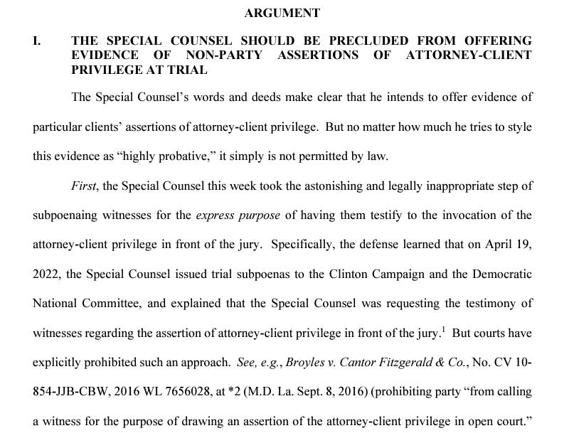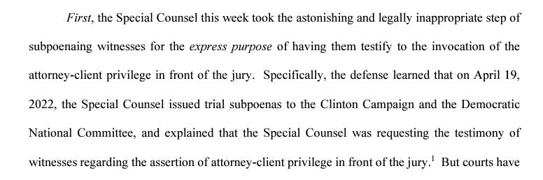 He did that by suddenly dropping trial subpoenas on certain people affiliated with Hillary for America and the DNC, where they were going to be compelled to come to court and specifically testify under oath before the jury about assertions of attorney client privilege they had made regarding certain documents.