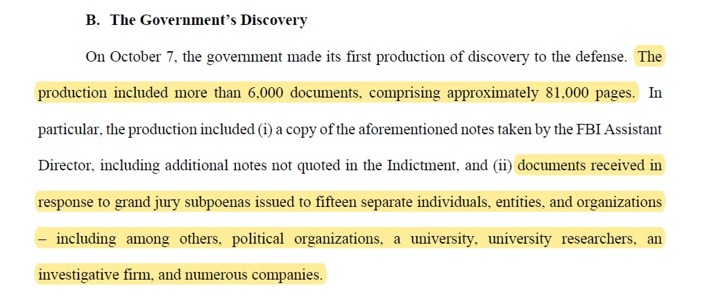 The amount of documents already handed over by all these parties to the Special Counsel’s Office is staggering, very likely well over 1 million. Durham let the court - and the public - know that in just Sussmann’s case of 1 single count of giving a false statement to a federal official, the discovery that the government was handing over to Sussmann and his defense team totaled over 80,000 pages.