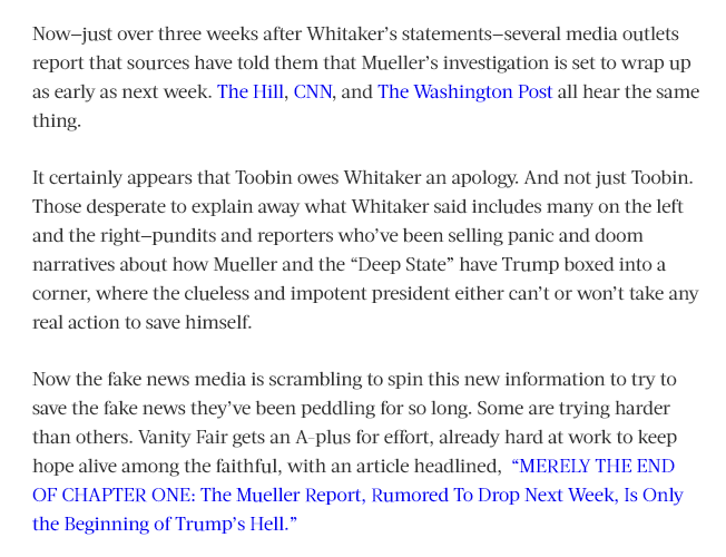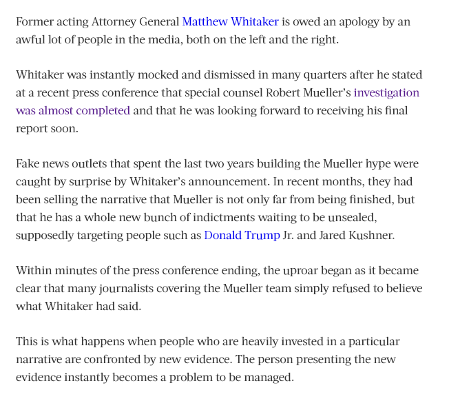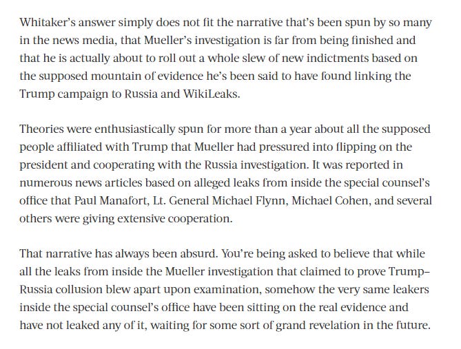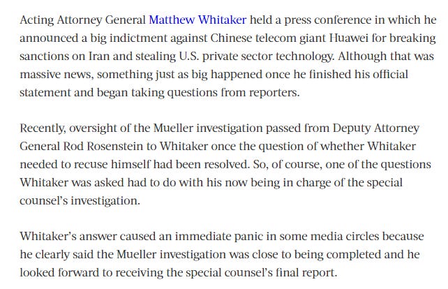 Some outlets actually went so far to claim that Whittaker was some kind of blind partisan so he was just making all this up about Mueller being almost finished, that he had no real information and didn't know what he was talking about.