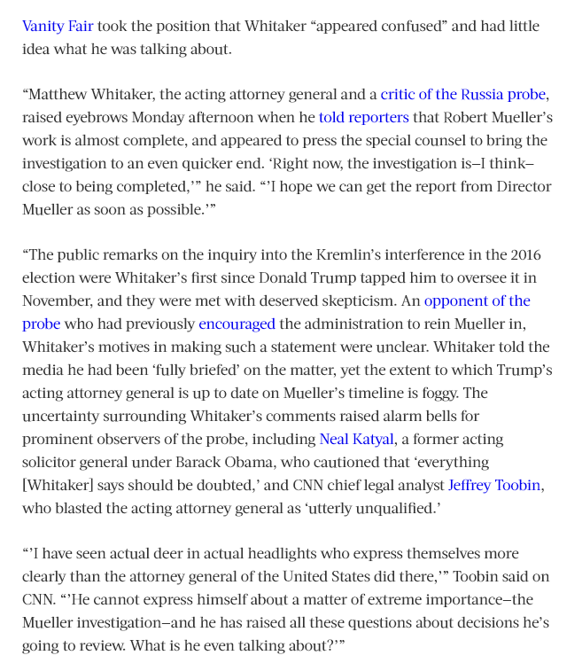 As just one example of the deluge of reporting that appeared calling Whittaker’s impartiality, judgment and competence into question, Vanity Fair rushed out a long piece claiming that Whitaker 'looked confused' and appeared to have no idea what he was saying.