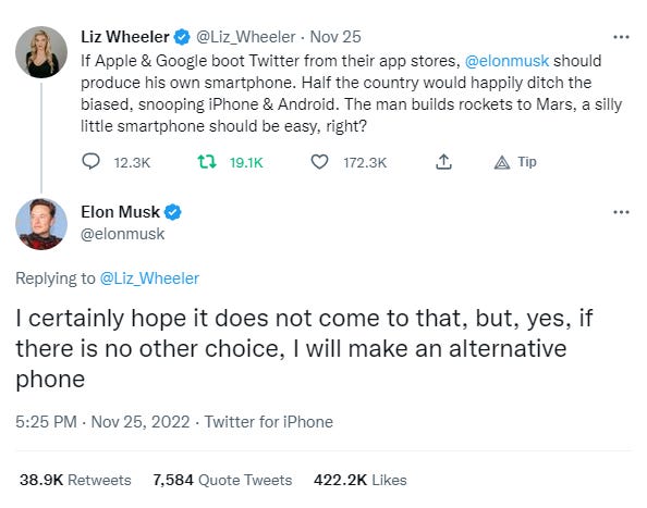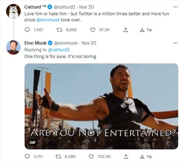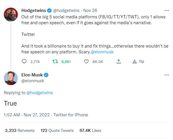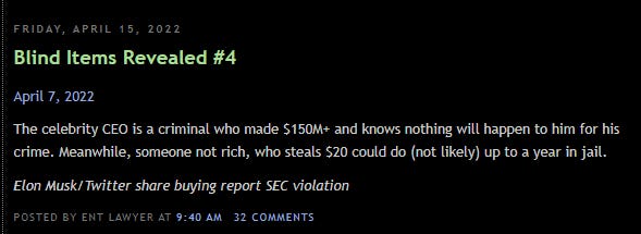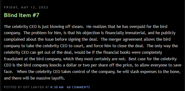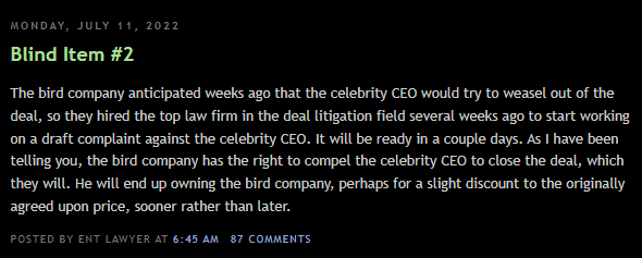 I follow the Crazy Days & Nights Blog where “Entertainment Lawyer” who runs the site [affectionately referred to as “Enty” by regular commenters there]. Enty is one of those assuming the Fake News coverage of Elon Musk’s hostile takeover of Twitter is accurate.