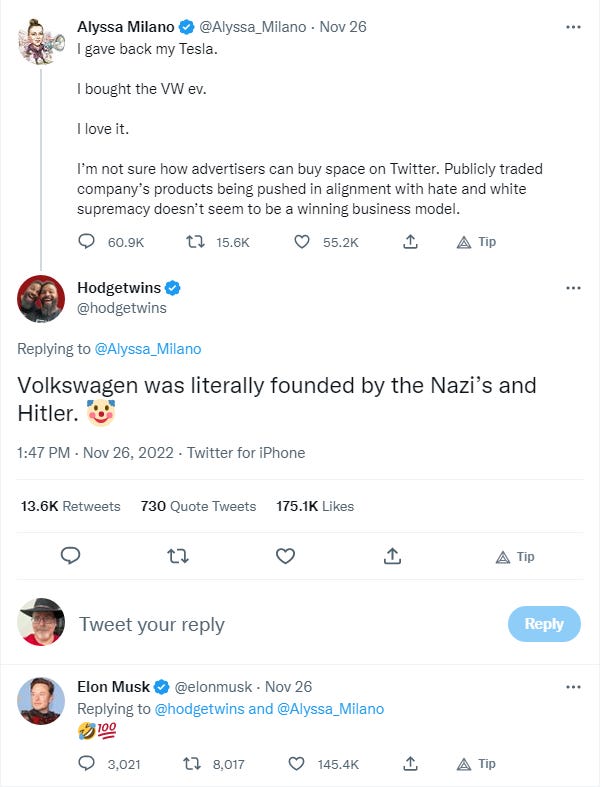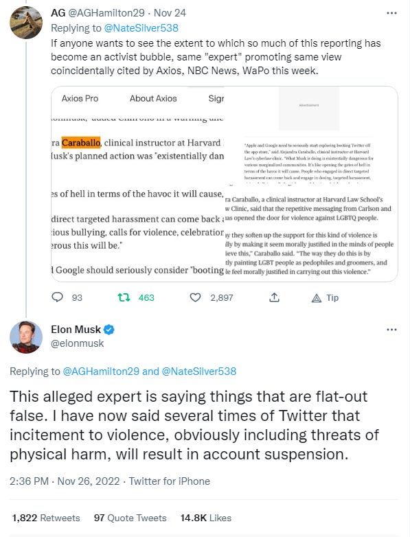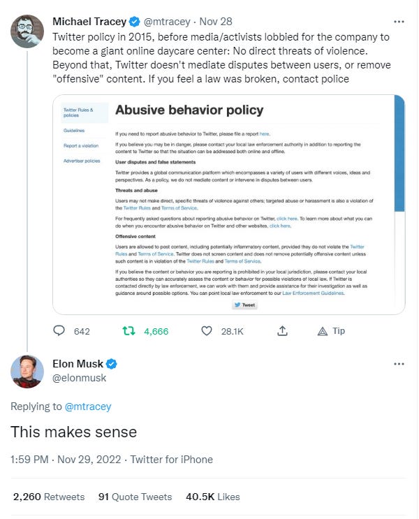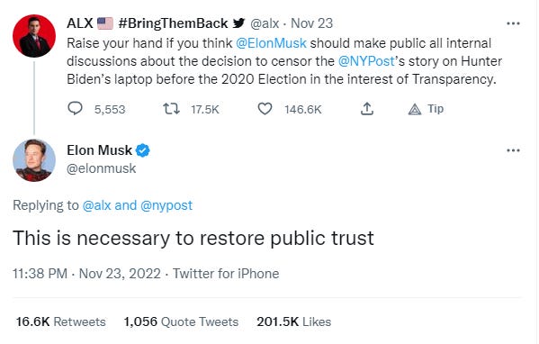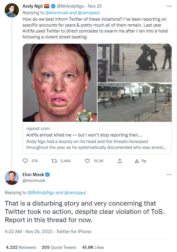 Musk then quietly removed the hashtags that had been used to drive much of the underground Twitter child pornography/exploitation market, and only began publicly commenting on it when platform users who’d been tracking the issue publicly thanked him for addressing that after Twitter’s Old Regime had ignored public complaints about it for 10+ years.