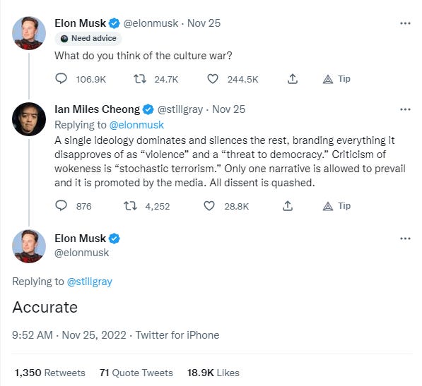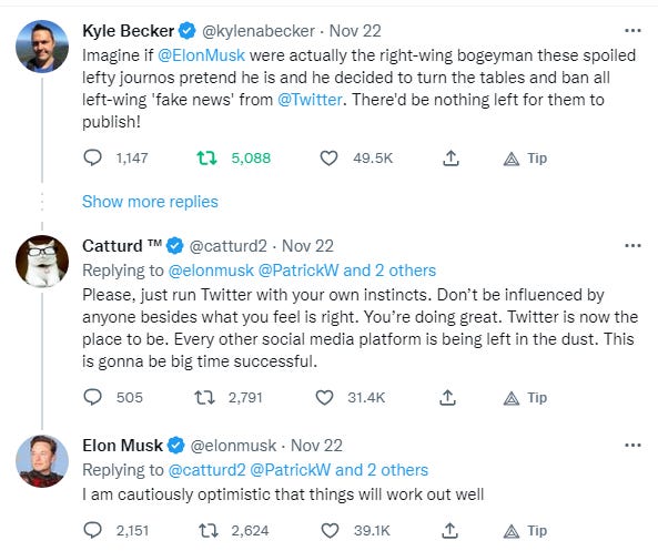 Musk has spent the last two weeks very pointedly engaging in direct Twitter conversations with markedly conservative-leaning accounts on the platform. Some examples: