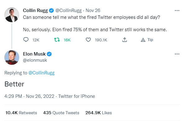 Musk proceeded to fire almost 2/3rds of Twitter’s employees. This led to massive expectation on the Left that Twitter was about to stop running and implode. Instead, the service seemed to be running better than ever.