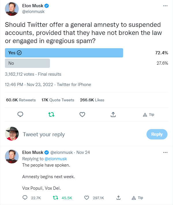 Musk then took a new poll about instituting an amnesty for Twitter’s millions of banned accounts that never broke any law or engaged in any spamming. When the majority of voters said yes, Musk announced a mass Twitter amnesty would occur.