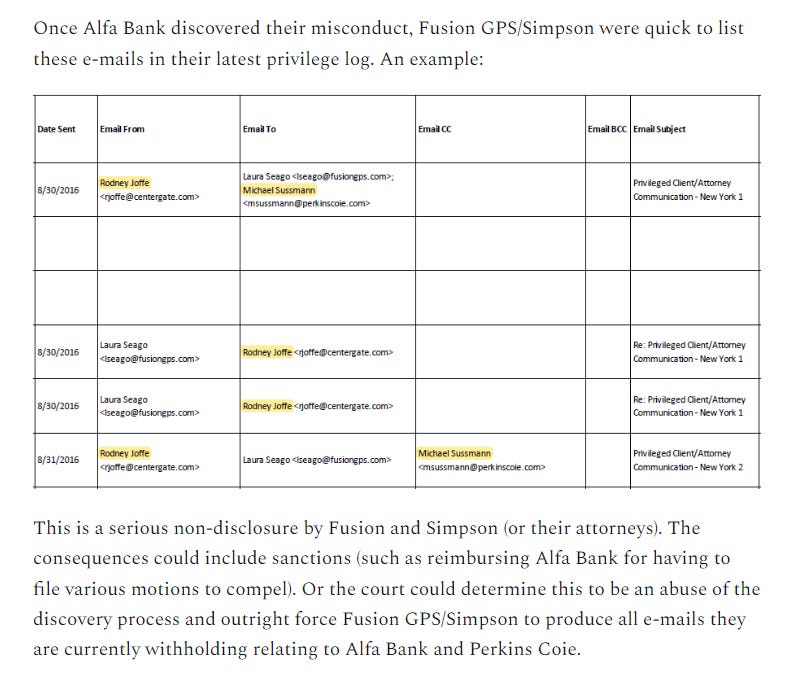 There’s another key piece of evidence that emerged recently: Fusion GPS was defying a court order by hiding emails directly related to it’s work on the Alfa Bank hoax. Techno Fog has a great post about it right here on Substack: