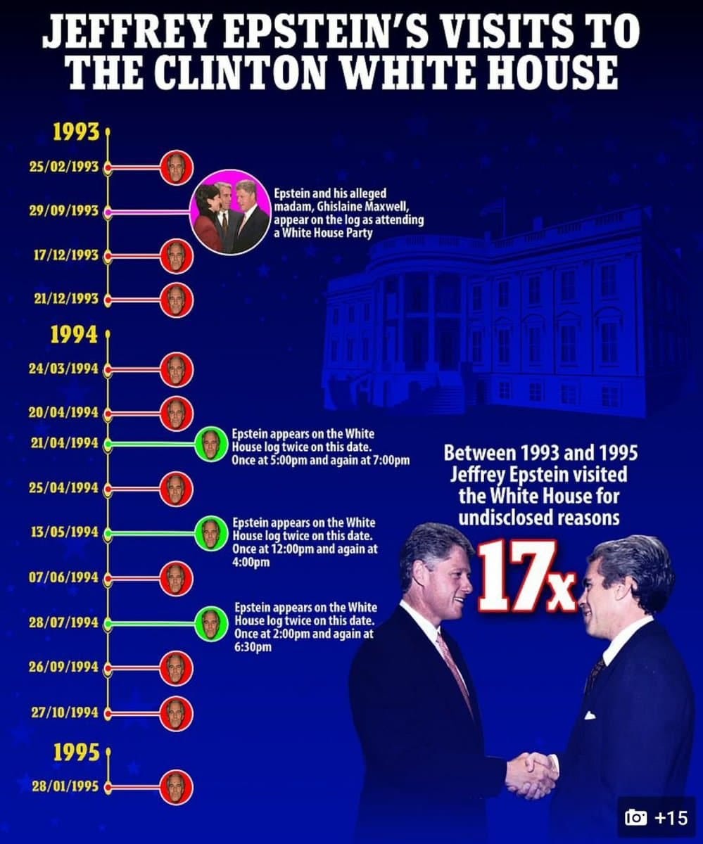 Somebody waited until **last week** to let it drop that Epstein [likely accompanied more than a few times by Maxwell] was hosted at the White House by President Bill Clinton at least seventeen times between 1993 and 1995.