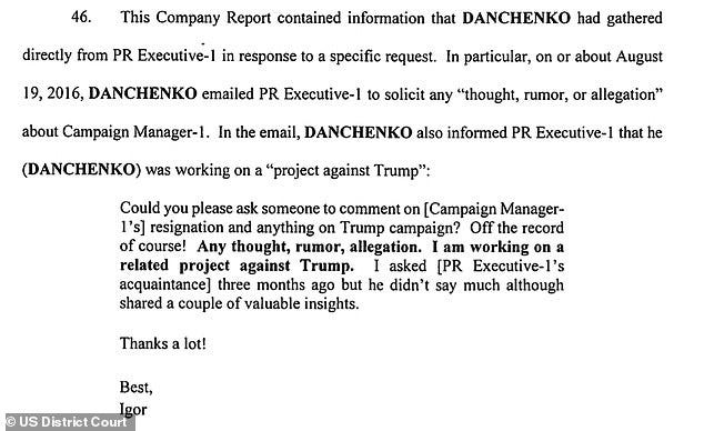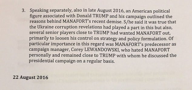 We know what one of the stories was that Dolan gave to Danchenko. His email to Danchenko about Paul Manafort’s firing as Donald Trump’s campaign chair appears almost verbatim in the dossier.