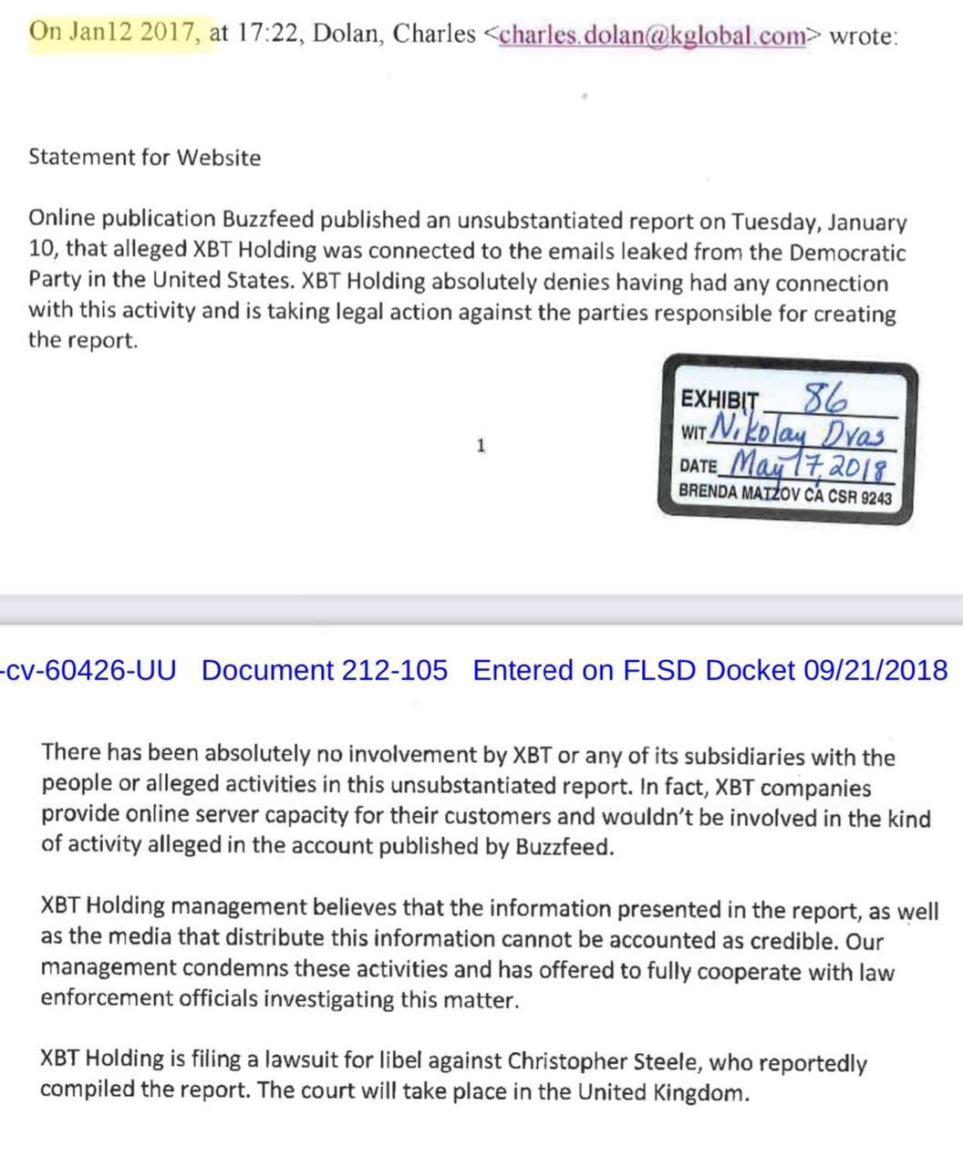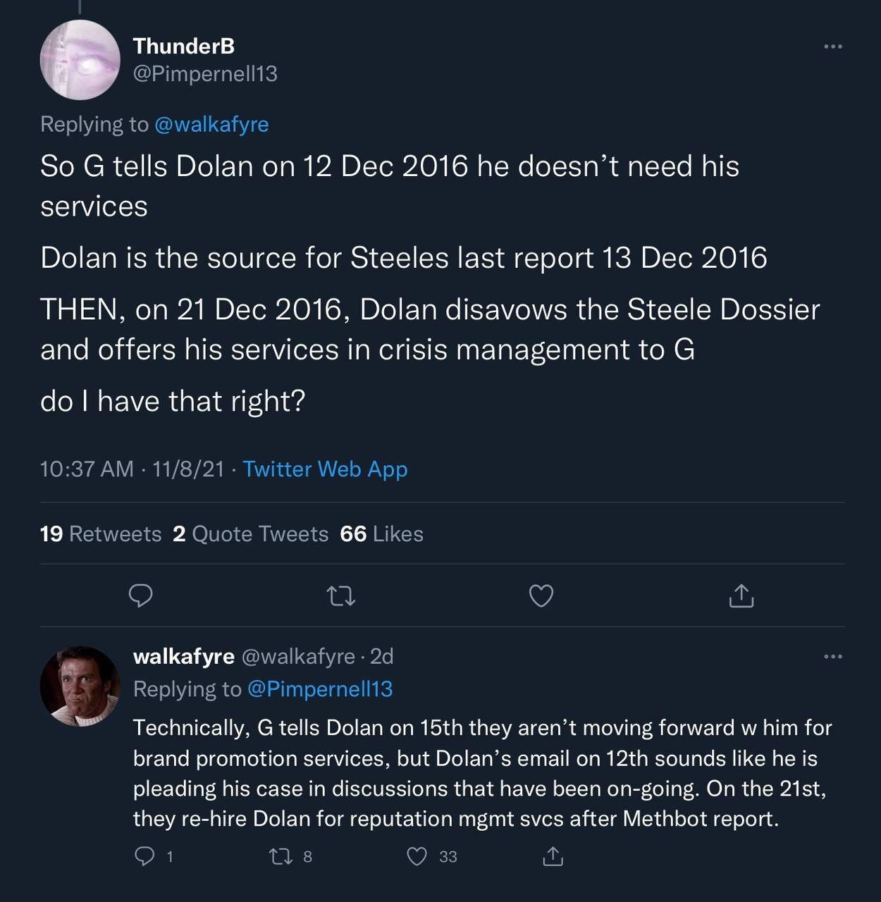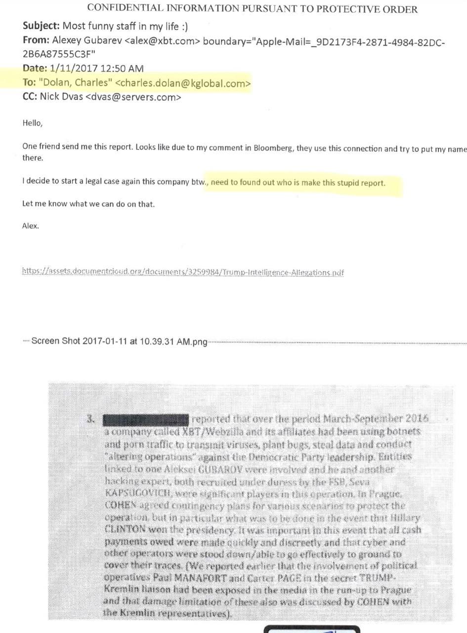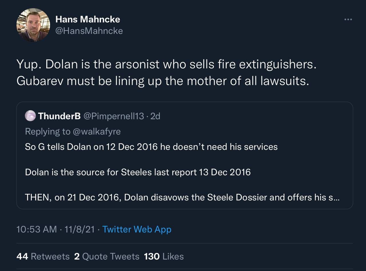 Dolan had a prior relationship with Gubarev before the Russian tech executive’s name was included in one of the last Steele Dossier entries. In fact, Dolan appears to have been trying to solicit public relations business from Gubarev, when Gubarev learned he was in the Steele dossier being accused of having facilitated the commission of a crime. When Gubarev needed some fast P.R., it sure was convenient that he knew a top DC PR specialist, isn’t it?