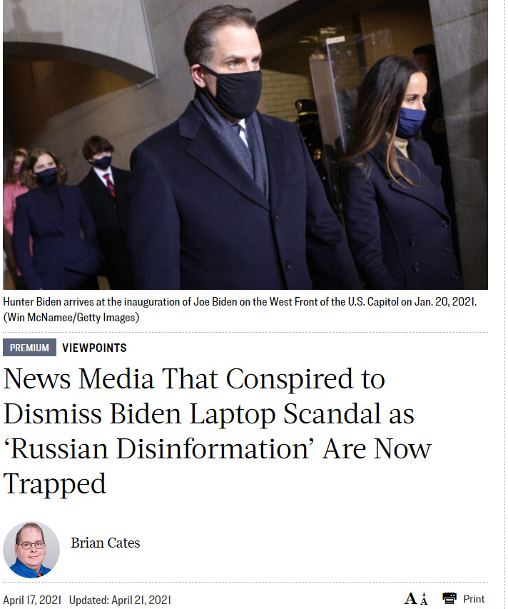 “News Media That Conspired to Dismiss Biden Laptop Scandal As ‘Russian Disinformation’ Are Now Trapped” - April 17, 2021.