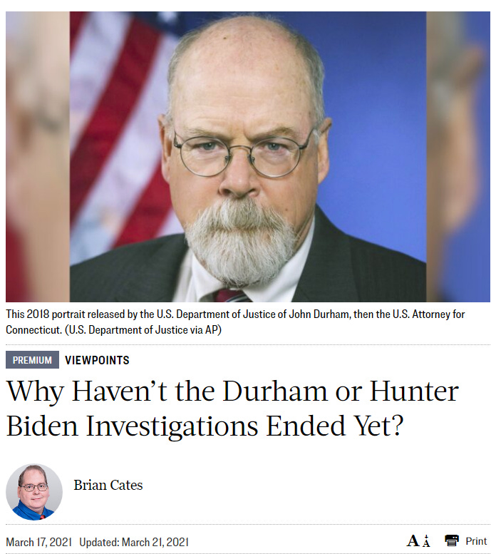 “Why Haven’t the Durham or Hunter Biden Investigations Ended Yet?” - March 17, 2021.