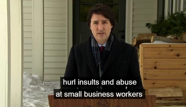 To hide the fact he’s provoked a genuine uprising of honest, hardworking citizens who are pissed-off at his power grabs and usurpations of their rights, he has to create a new narrative that makes HIM the fearless intrepid defender of small business owners, the homeless, minorities, public property and of Canada’s veterans bravely standing up to an evil rampaging mob of violent racist vandals.