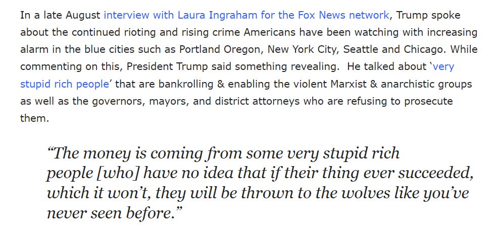 President Donald J. Trump discussed the high level of funding and organization behind the riots several times, including in a televised interview with Fox News host Laura Ingraham, where he openly talked about the ‘very stupid rich people’ working from ‘the shadows’ who’s ‘names you wouldn’t recognize’ behind the funding and organization driving the revolutionary groups acting as the Great Reset’s shock troops.