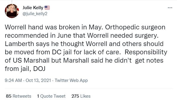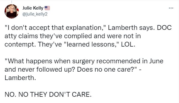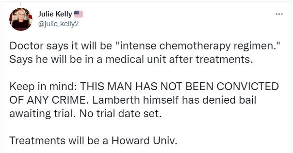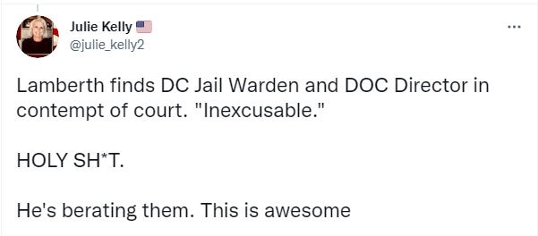 Which directly brings up the fact that the D.C. jail is not giving it’s prisoners adequate medical care. And as Judge Lamberth himself had noted back in September, if the jail cannot provide adequate medical treatment for some of the J6 defendants, then they should be removed from that jail and sent to a correctional facility that does have the ability to treat them.