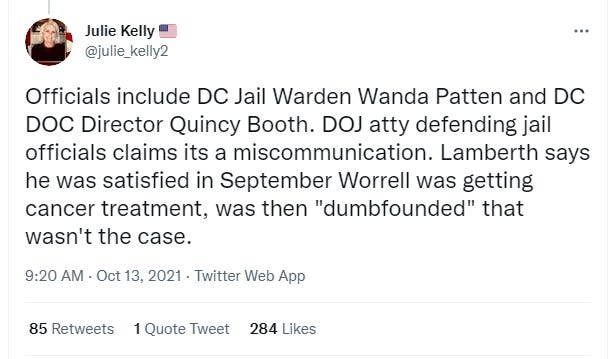 So yesterday a federal judge found the Director of the Dept. of Corrections for the District of Columbia Quincy Booth and the warden of the D.C. jail Wanda Patten in contempt of court for not handing over required documents relating to the medical treatment of a January 6 prisoner with a broken wrist who has cancer.