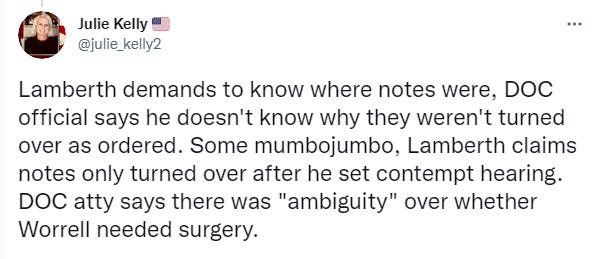 DOC attorney now tries to float the claim that the reason Judge Lamberth’s court order about Worrell’s medical treatment was not complied with is because there was ‘ambiguity’ over if Worrell needed surgery for his broken hand.