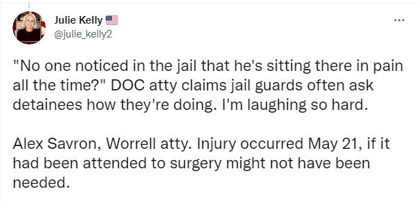 DOC lawyer lamely says the guards talk to the patients all the time and floats the excuse that Worrell never complained about being in pain. This is indeed laughable.