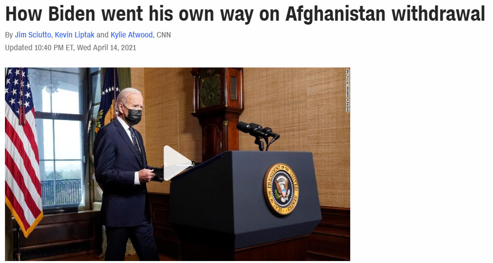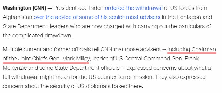 So what’s the problem with that scenario? Only that we’ve had multiple published news reports over the past two weeks that Biden’s military and intelligence advisers after hearing Biden’s plan, strongly urged him not to withdraw from Afghanistan in that fashion…and yet Biden overruled them and plunged ahead anyway.