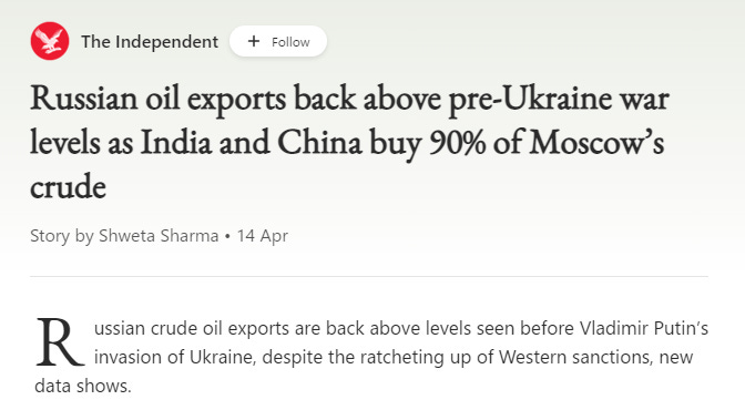Thanks to new BRICs energy trade deals for oil where the transactions are being made in currencies like the Chinese yuan, Russia has now reached oil exports to the same level as before the NATO sanctions were implemented.