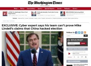 The fact there were big problems within the Symposium’s Cyber Team was evident even before the Symposium’s third day got underway, when a story appeared in the Washington Times. Two members of that cyber team, Josh Merritt and J. Kirk Wiebe, told a reporter that Lindell was wrong about these pcaps; they didn’t prove anything, certainly not that China hacked the 2020 election.