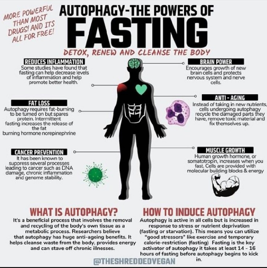 So Autophagy helps you clean and repair yourself at the cellular level, reset and strengthen your immune system, improve your body’s ability to remove waste, reduce stress and aging of your cells, lose fat, better absorb nutrients, reduce inflammation and the effects of chronic illnesses, and last but not least, prevent the formation of cancerous tumors made up of pathogens and broken, toxic cells.