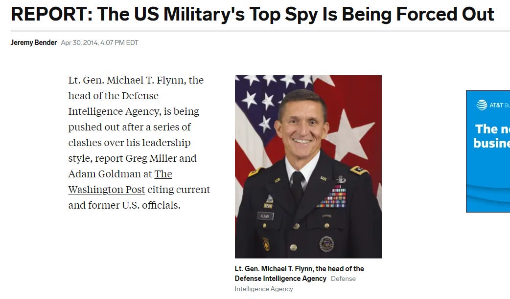 Flynn finally seems to have gotten Obama’s undivided attention by the Spring of 2014, which is when Flynn was informed that his services as head of the DIA were no longer required, and that Obama was firing him and replacing him with someone who would not be quite so problematic for the administration’s direction and goals.