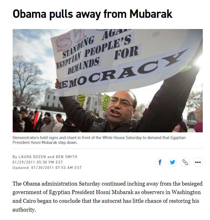 Obama refused to aid the Green Revolution in Iran while simultaneously managing to topple Mubarak of Egypt and actively helping to replace him with an actual member of the terrorist group the Muslim Brotherhood. Mohammad Morsi and his Muslim Brotherhood government then proceeded to unleash a bloody wave of terror over that country that led to the first crucifixions of Christians since the first century.