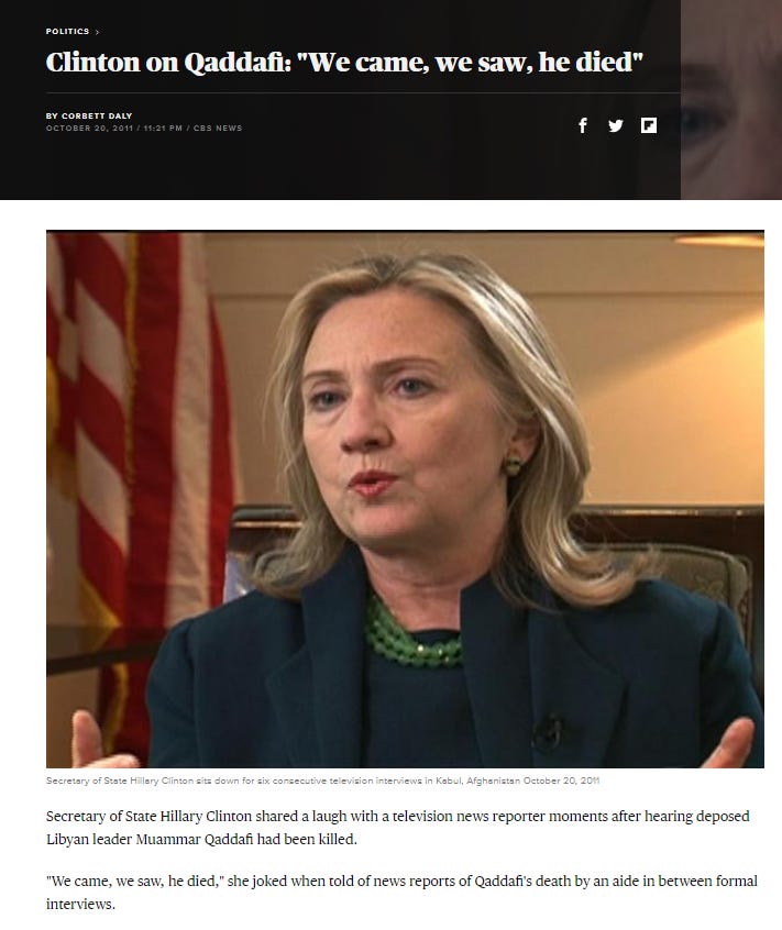 While things were unfolding as they were in Egypt from 2011-2013, another country getting supposedly brilliant foreign policy nuance thanks to the intelligence and sophisticated international machinations of Obama and his intrepid Secretary of State Hillary Clinton was Libya.